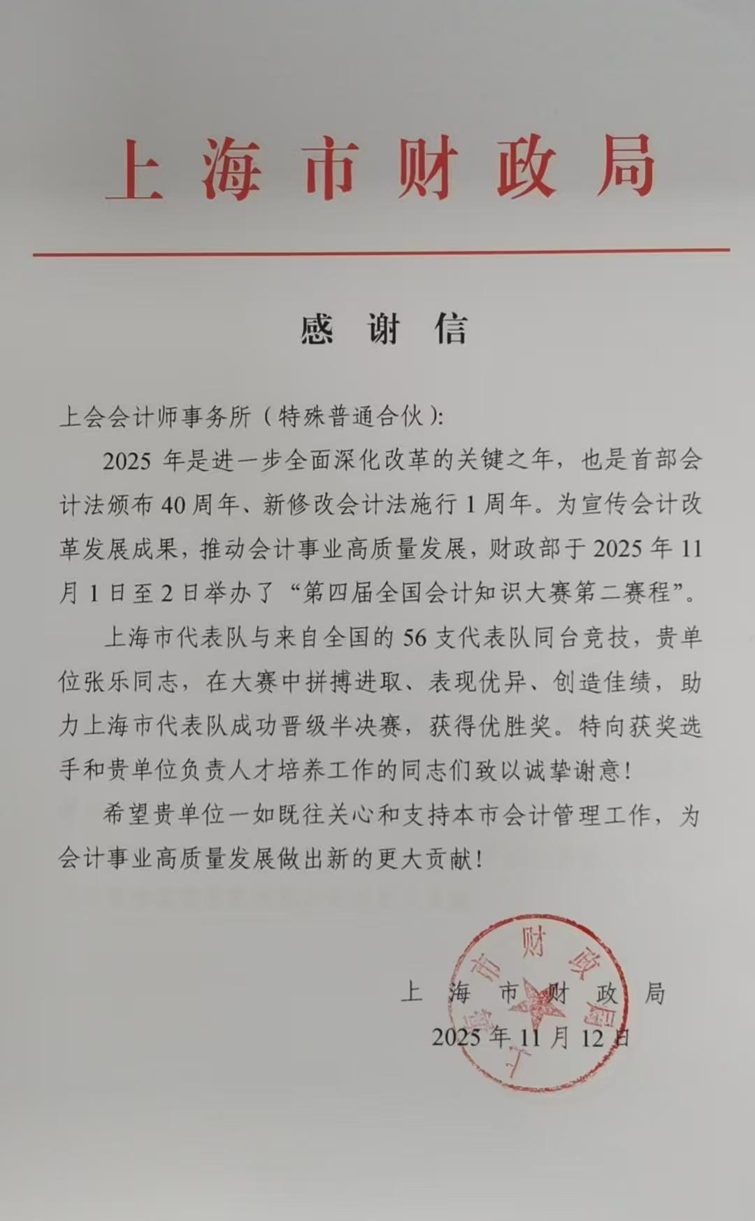 赛后,上海市财政局特向上会会计师事务所发来感谢信,对事务所为上海代表队取得优异成绩给予的支持与贡献表示肯定。未来,上会会计师事务所将持续积极支持上海市会计管理工作,深耕专业服务,为推动我国会计事业高质量发展贡献更大力量。