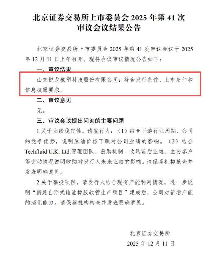 本所服务的客户山东悦龙橡塑科技股份有限公司,在2025年12月11日通过北京证券交易所上市委员会2025年第41次审议会议顺利过会!